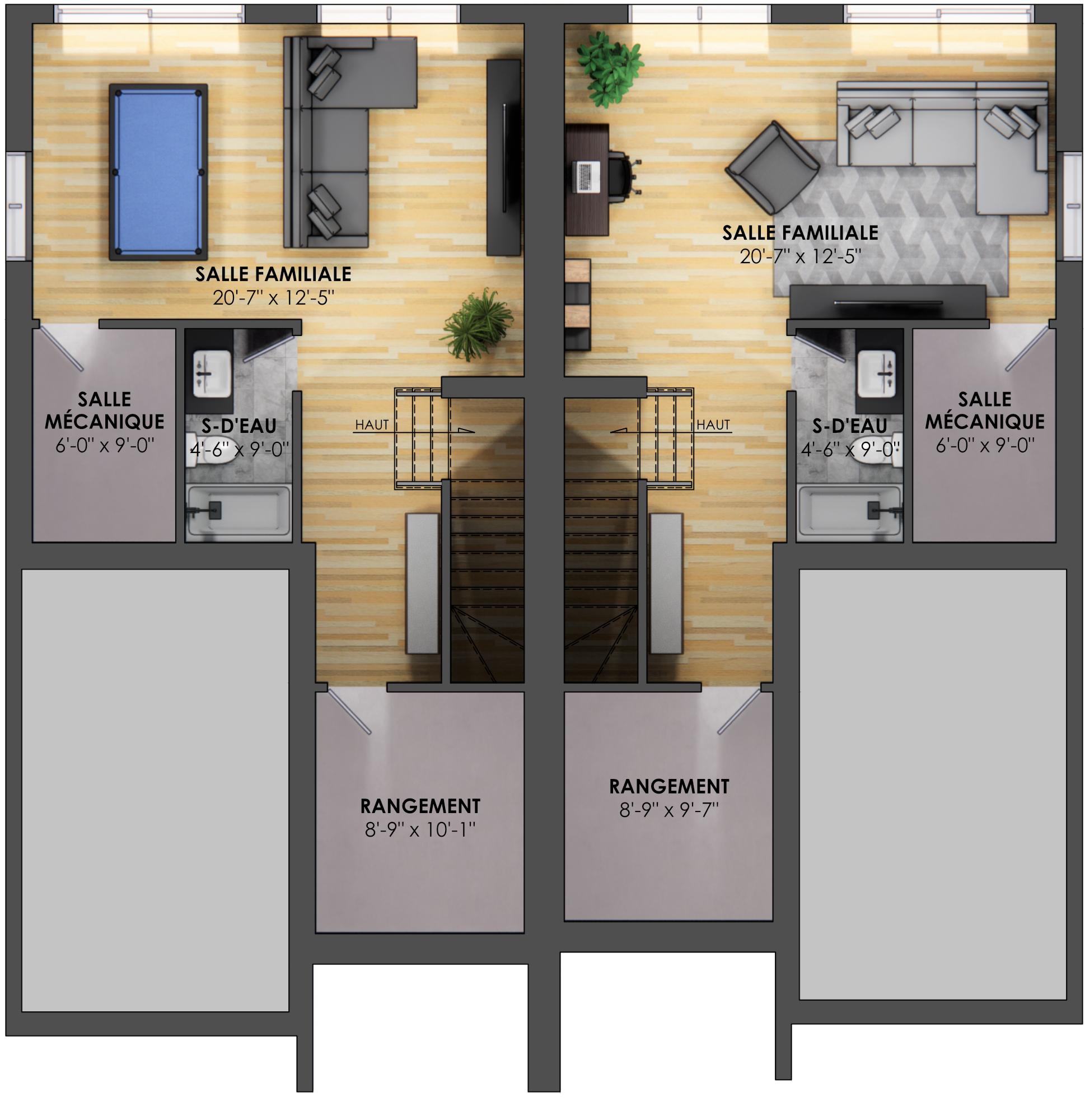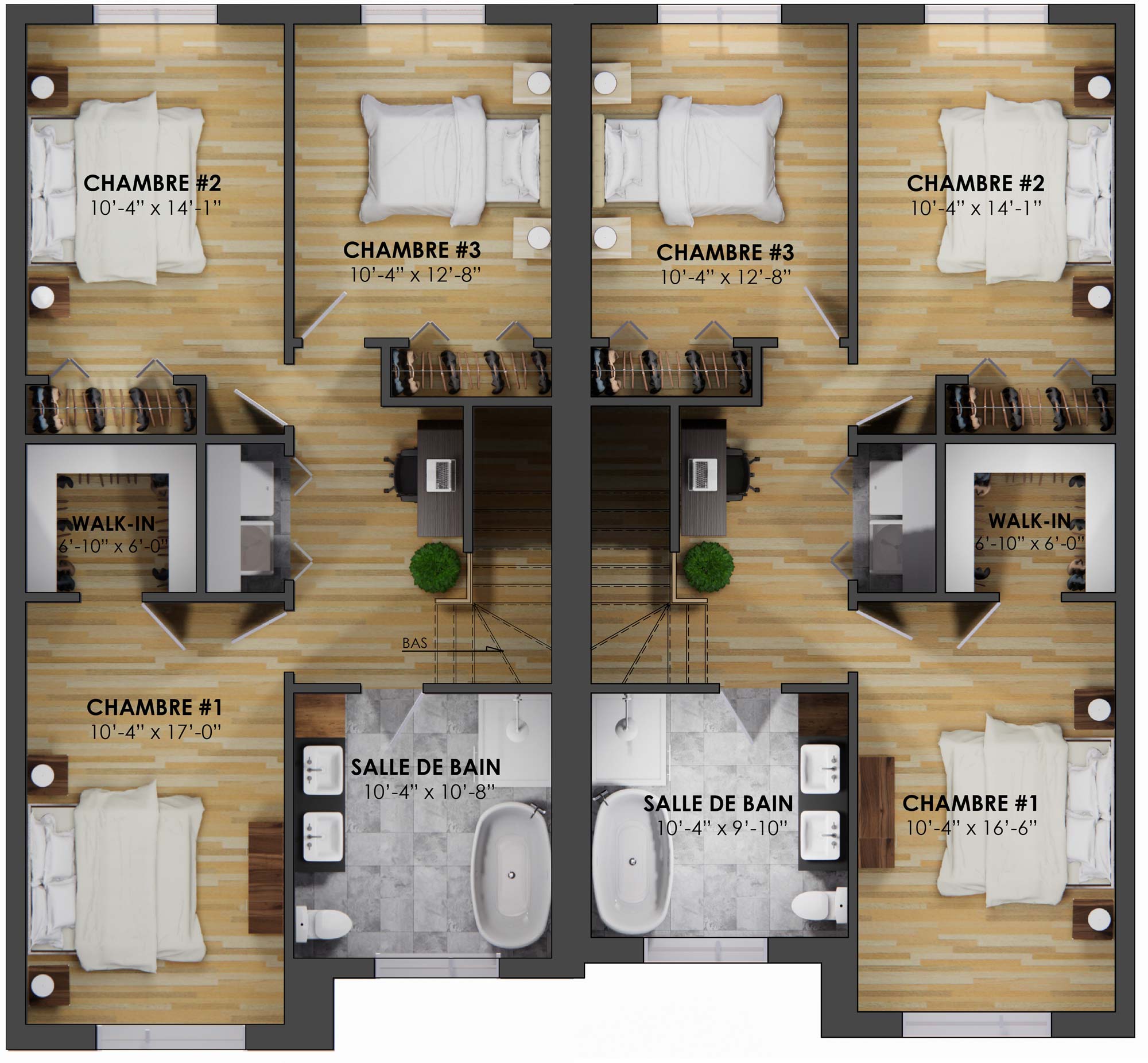 - Bois franc teint et vernis 3-1/4’’ au rez-de-chaussé, incluant les chambres